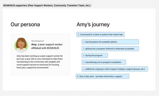 Dans l’atelier sur le parcours de l’utilisateur, nous avons exploré le processus que les personnes ont suivi pour faire référence aux services du BCMHSUS ainsi que celui des personnes qui les ont aiguillées. Cela a aidé à éclairer notre architecture d’information, la carte du site ainsi que mon wireframing. Le processus de référence et de consultation se reflète dans le parcours de l’utilisateur du site.