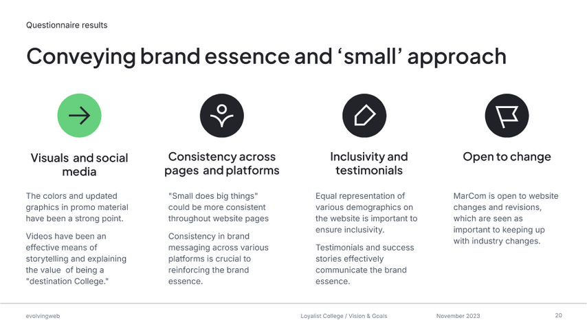 Un fort consensus existait sur le fait que l'information était difficile à trouver et qu'une refonte majeure de l'architecture de l'information s'imposait. La nécessité de démontrer les valeurs du collège, ses différents campus, ses programmes et son innovation tout en restant une petite communauté dynamique était une priorité absolue.