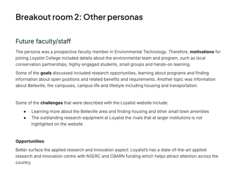 Les professeurs et le personnel ont tous signalé des problèmes similaires pour trouver des informations pertinentes et à jour sur les offres d’emploi et les possibilités de carrière. Le Loyalist College utilise une plateforme distincte pour les carrières, de sorte que la section des demandes d’emploi était inaccessible, mais j’ai appris que nous pourrions fournir plus de renseignements et d’orientation sur les emplacements, les campus et les cheminements de carrière avant que les professeurs et le personnel potentiels ne se rendent sur la plateforme externe. Ils ont également dit qu’ils voulaient en apprendre davantage sur le campus principal de Belleville et sur ce à quoi ressemblerait la vie là-bas.